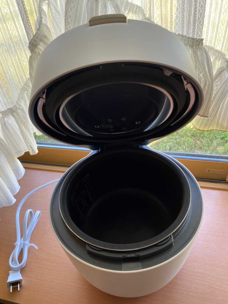 この炊飯器、従来のような取手がないので、両手で下から抱えるように持ちます。意外にコンパクトです。