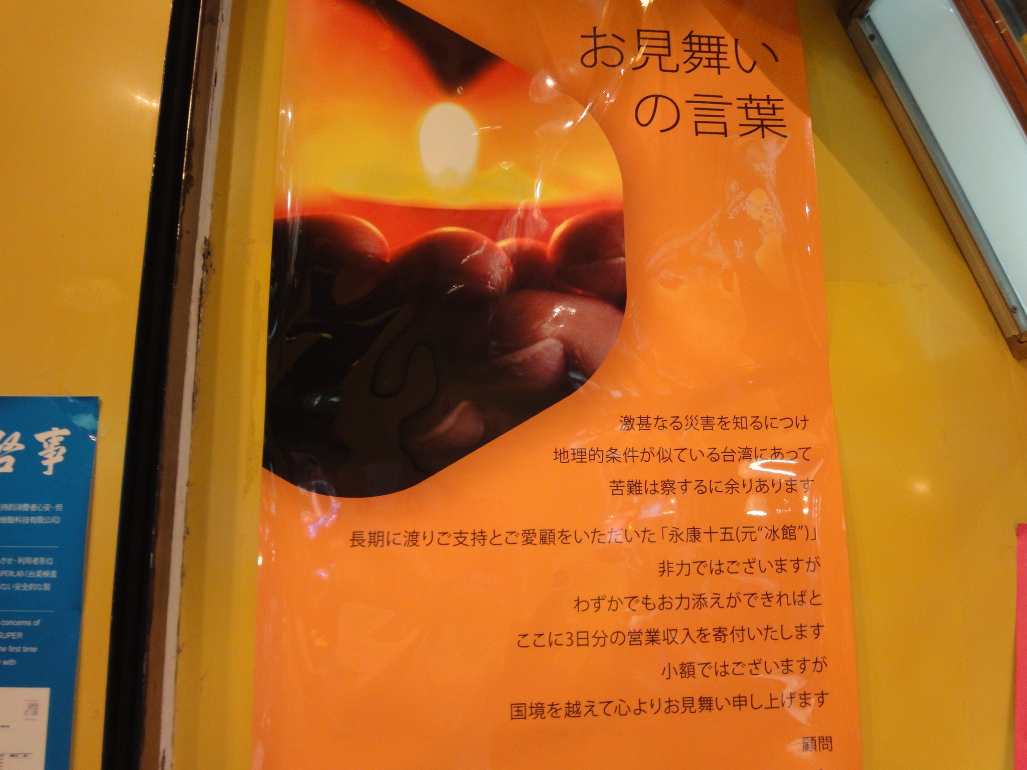 この画像は、震災の年の2011年7月に台湾を訪れたときに、現在のICE MONSTERの前身である永康15(元氷館)を訪れたときに、お店の壁に貼られていたものです。