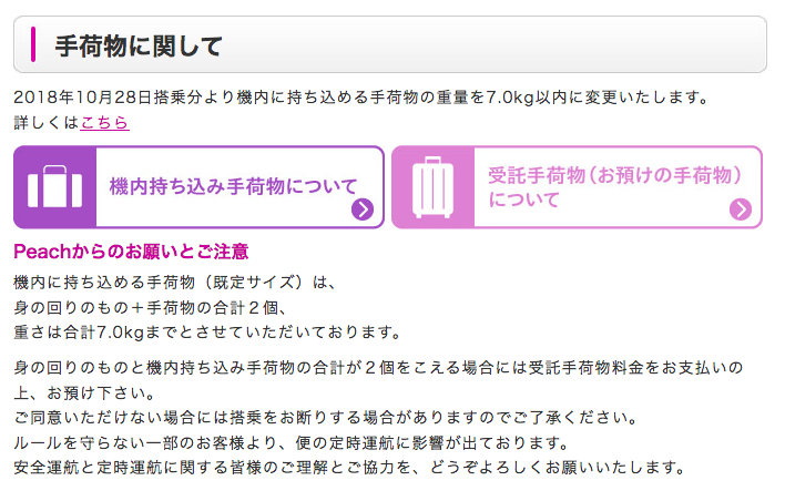 Peach機内に持ち込める手荷物(既定サイズ)は、 身の回りのもの+手荷物の合計2個、 重さは合計7.0kgまで